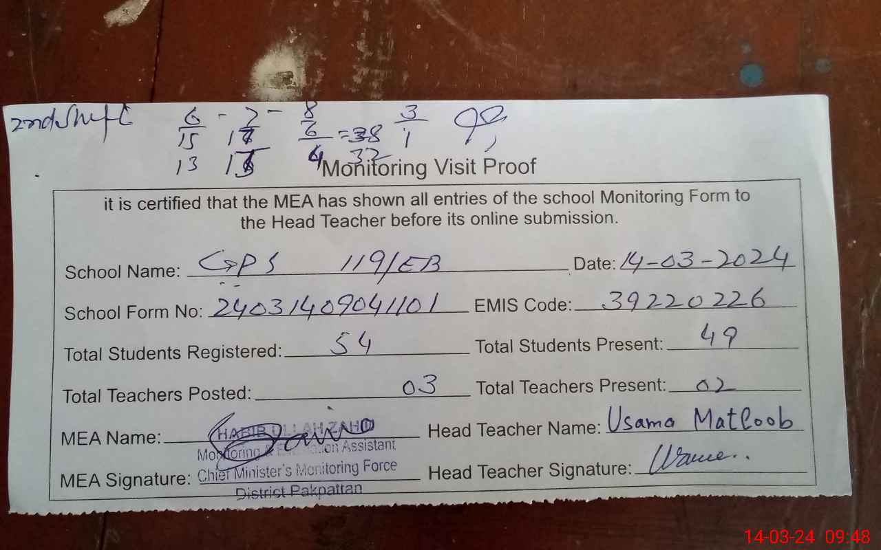 | EMIS Code: 39220226 | Name of School: GPS 119 EB ARIF WALA | |||
