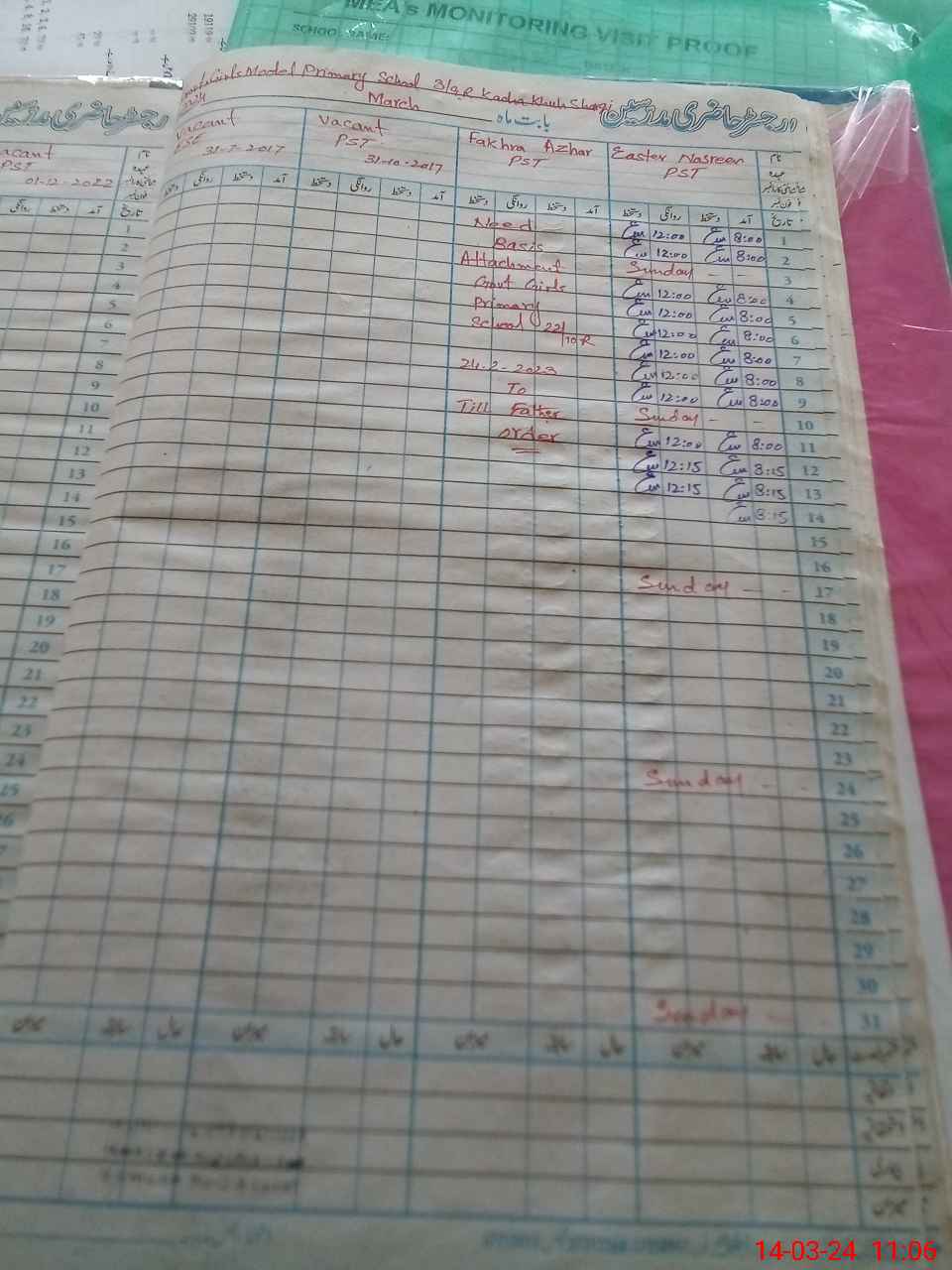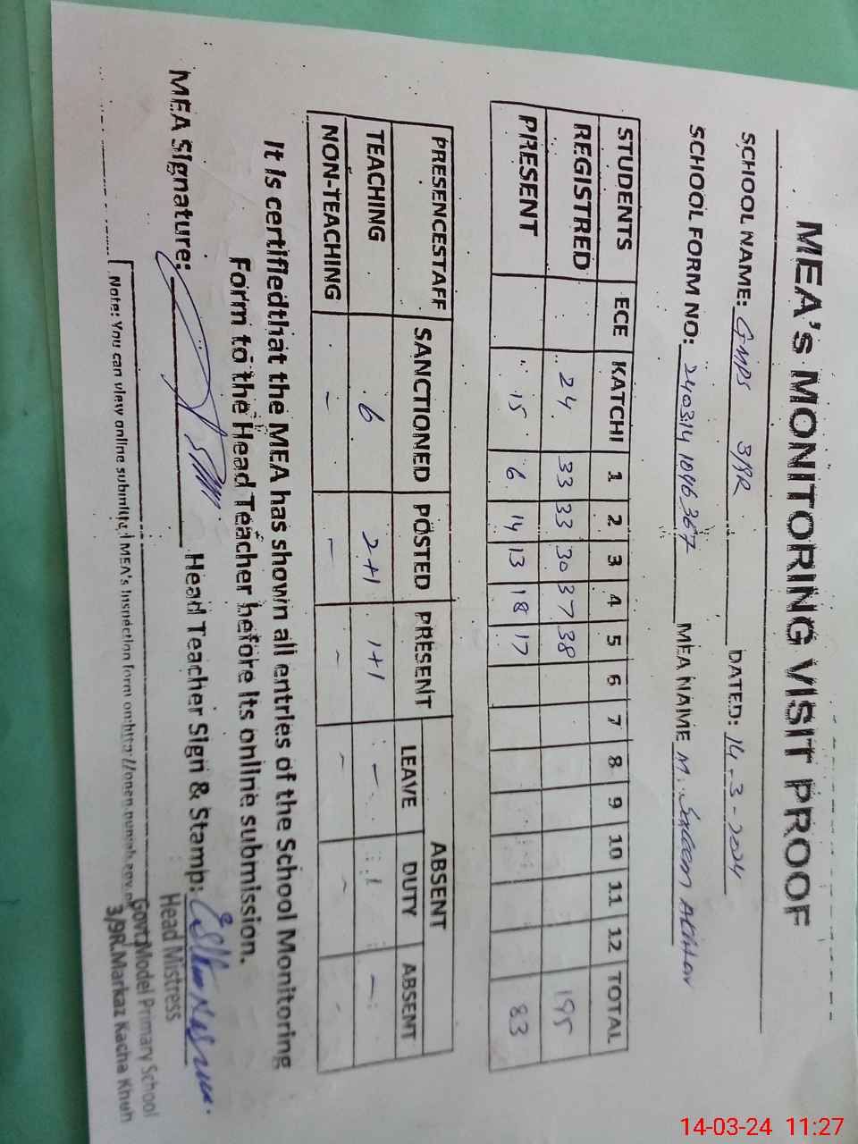 | Attendance Register | Head Teacher | MEA with School | Visit Proof |