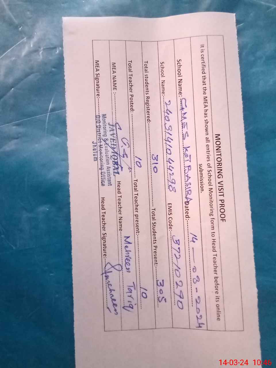 | Certified that this School was Inspected by the Undersigned MEA/DMO Today and the Information Stated Above is as Per Record. | |||||