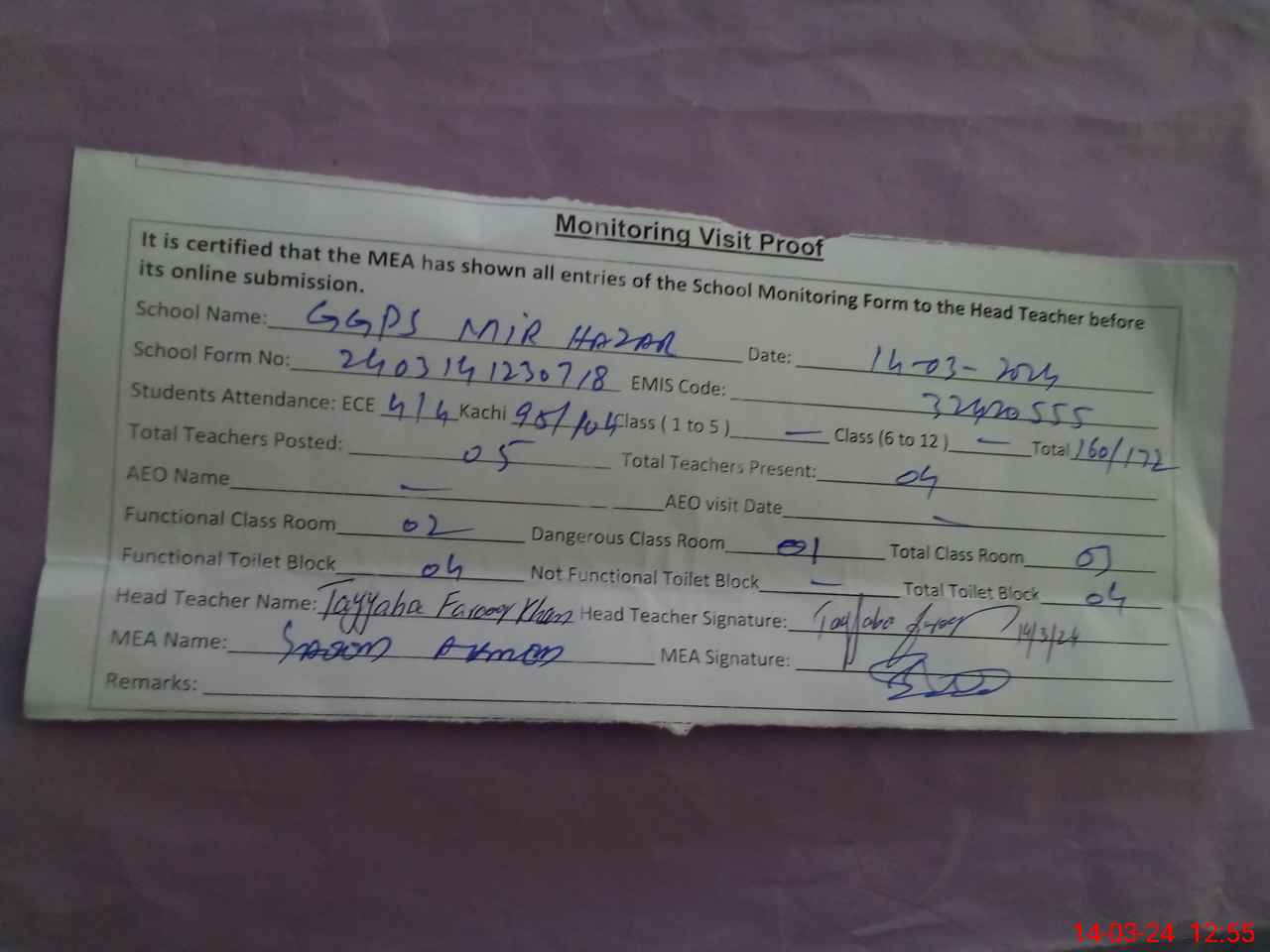 | EMIS Code: 32420555 | Name of School: GGPS MIR HAZAR | |||