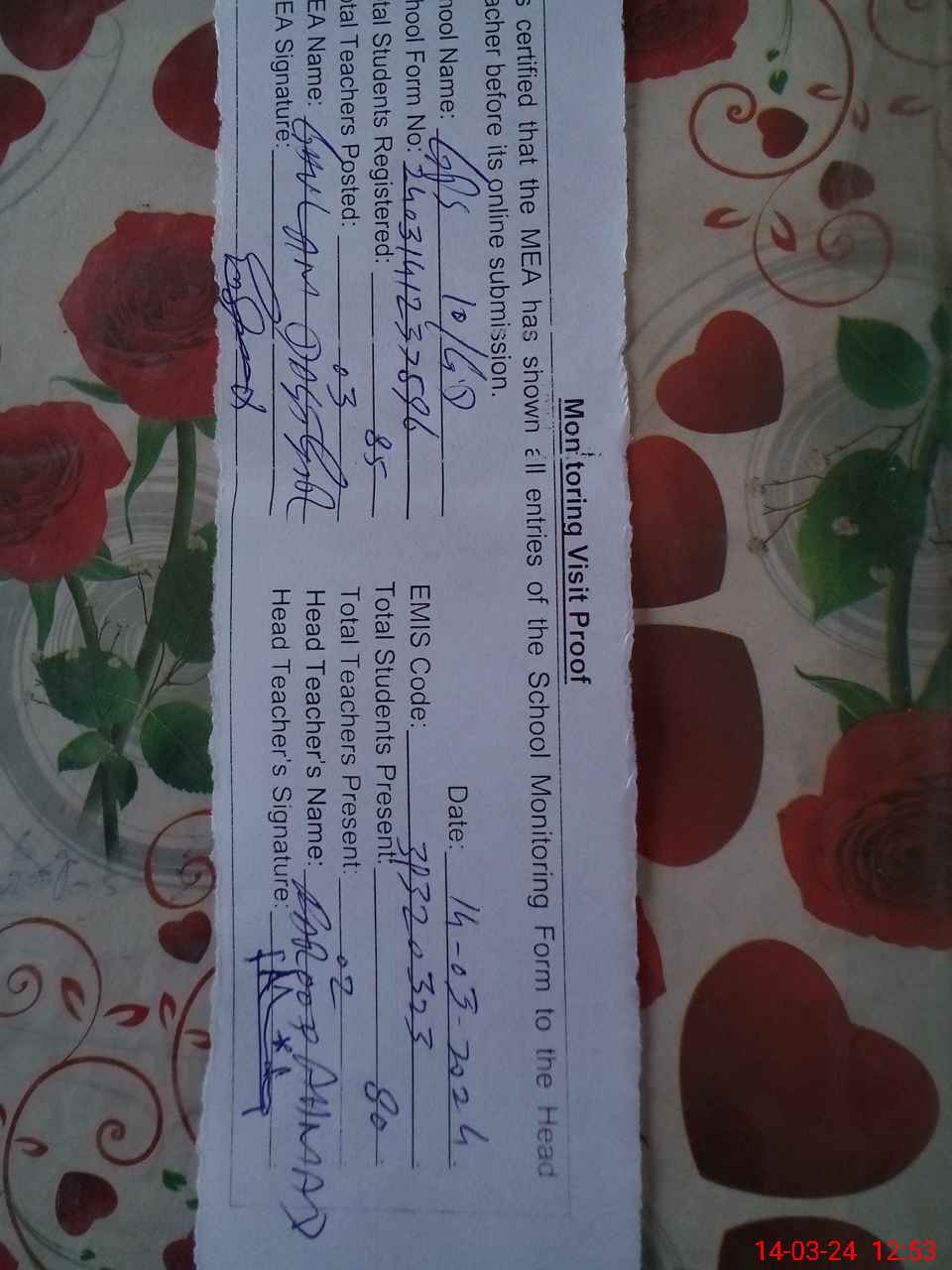 | Attendance Register | Head Teacher | MEA with School | Visit Proof |
