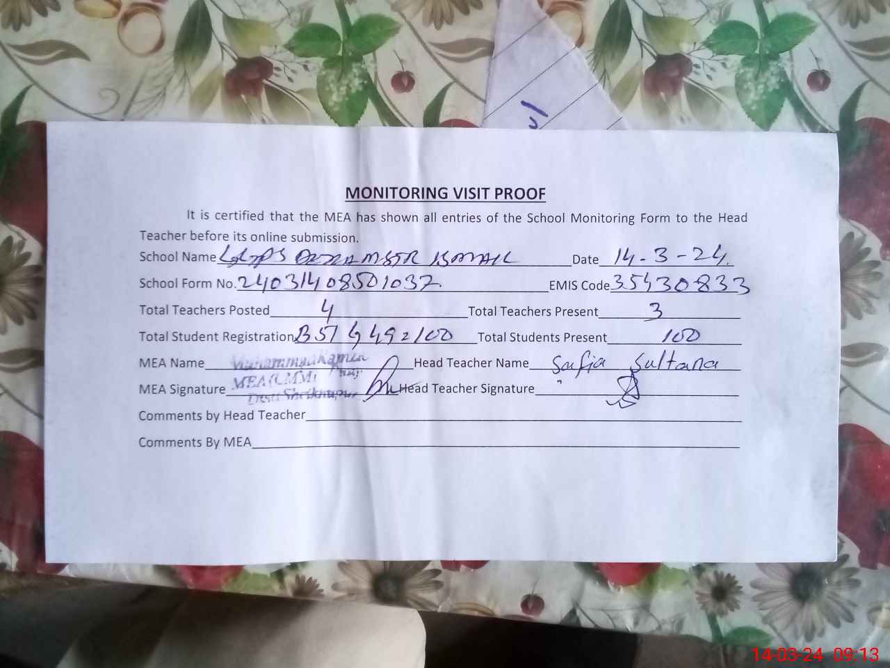 | Attendance Register | Head Teacher | MEA with School | Visit Proof |