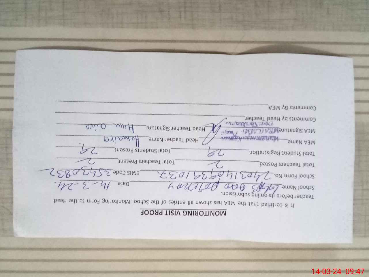 | Attendance Register | Head Teacher | MEA with School | Visit Proof |