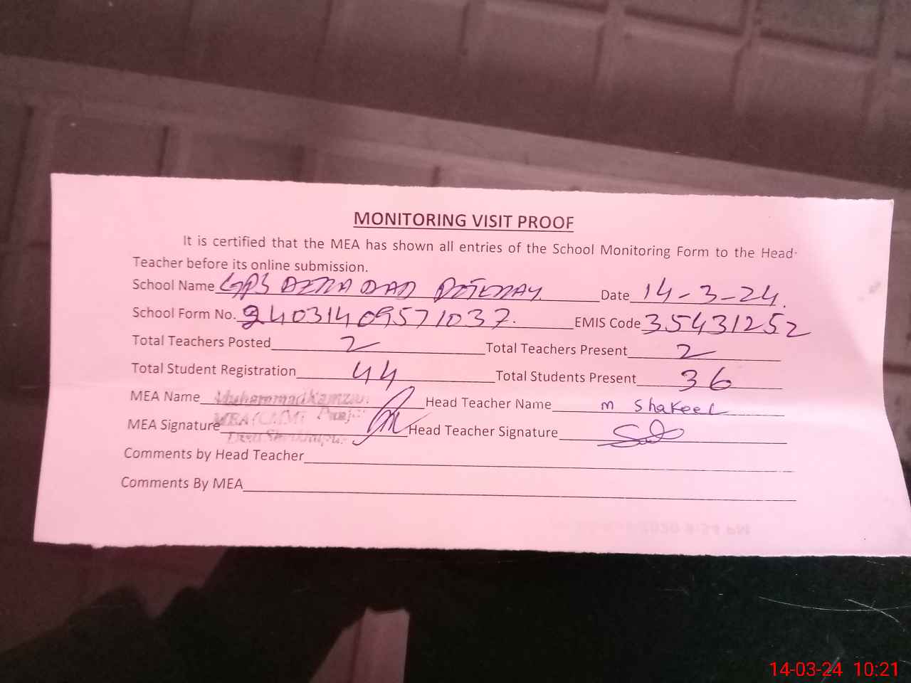 | Certified that this School was Inspected by the Undersigned MEA/DMO Today and the Information Stated Above is as Per Record. | |||||