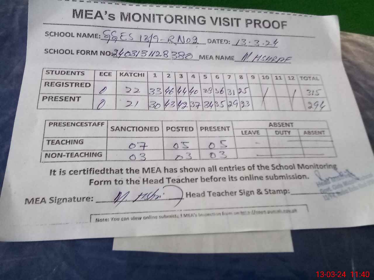 | Attendance Register | Head Teacher | MEA with School | Visit Proof |