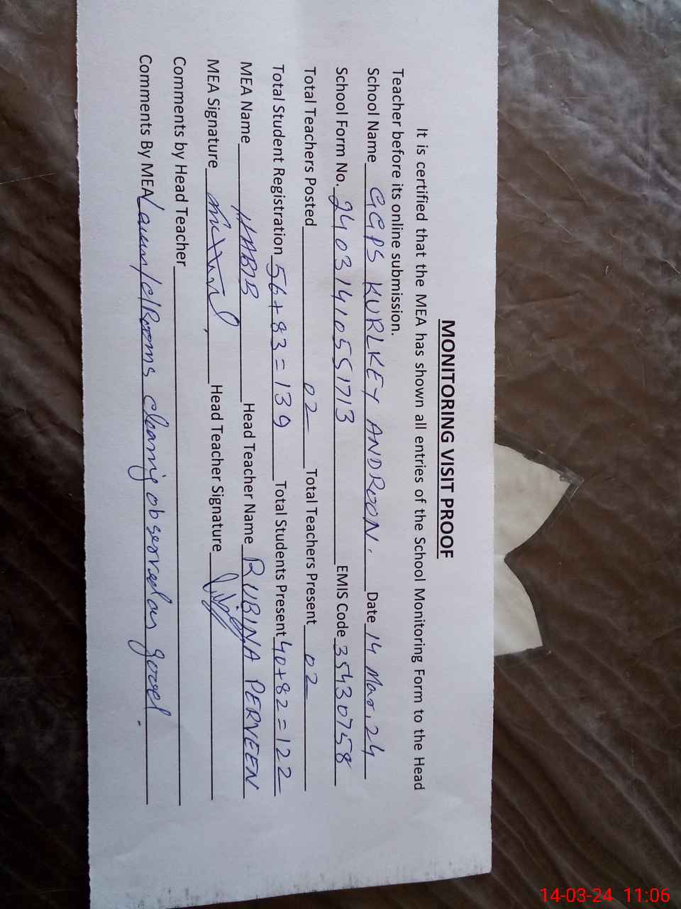 | Attendance Register | Head Teacher | MEA with School | Visit Proof |
