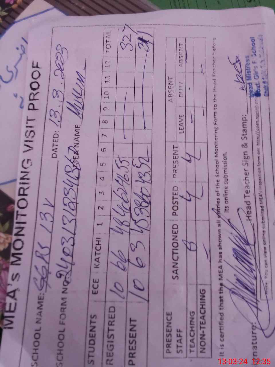 | EMIS Code: 36410346 | Name of School: GGPS 13/V, KABIRWALA | |||