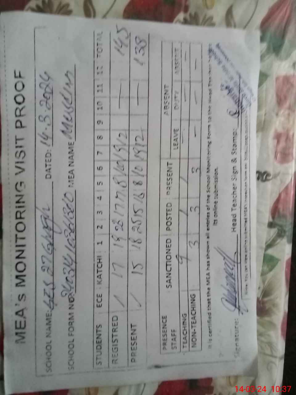 | Attendance Register | Head Teacher | MEA with School | Visit Proof |