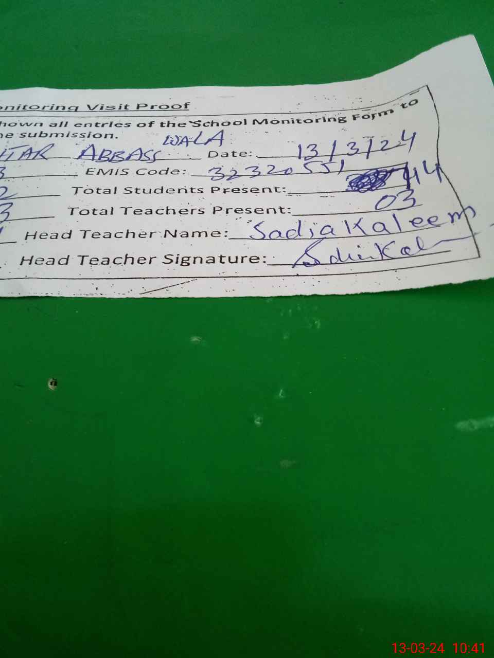 | Attendance Register | Head Teacher | MEA with School | Visit Proof |