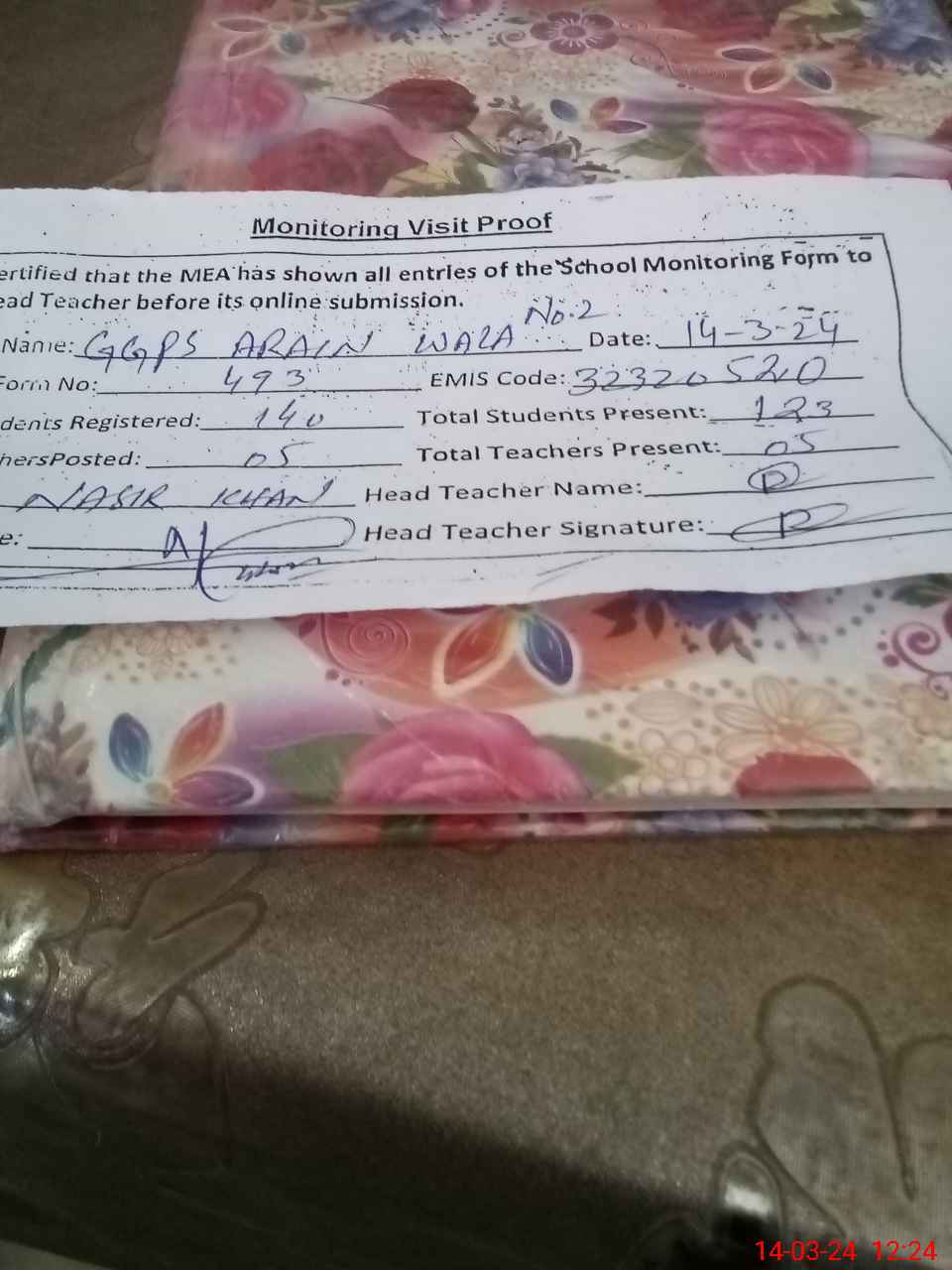| EMIS Code: 32320520 | Name of School: GGPS ARAIN WALA NO.2 | |||