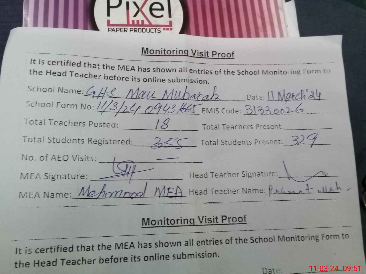 | EMIS Code: 31330026 | Name of School: GHS MAU MUBARAK | |||