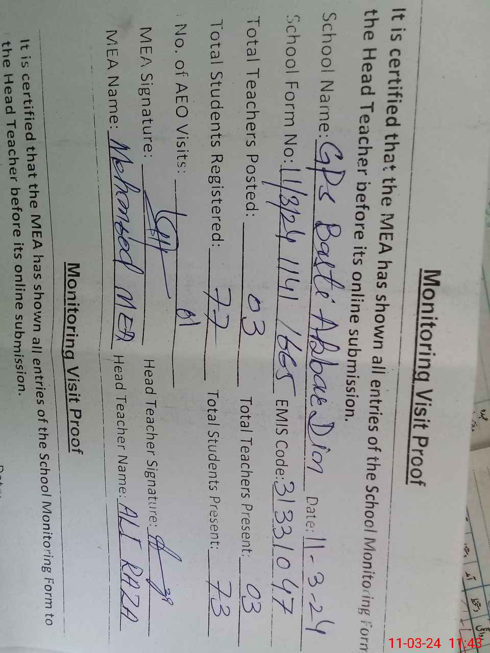 | Certified that this School was Inspected by the Undersigned MEA/DMO Today and the Information Stated Above is as Per Record. | |||||