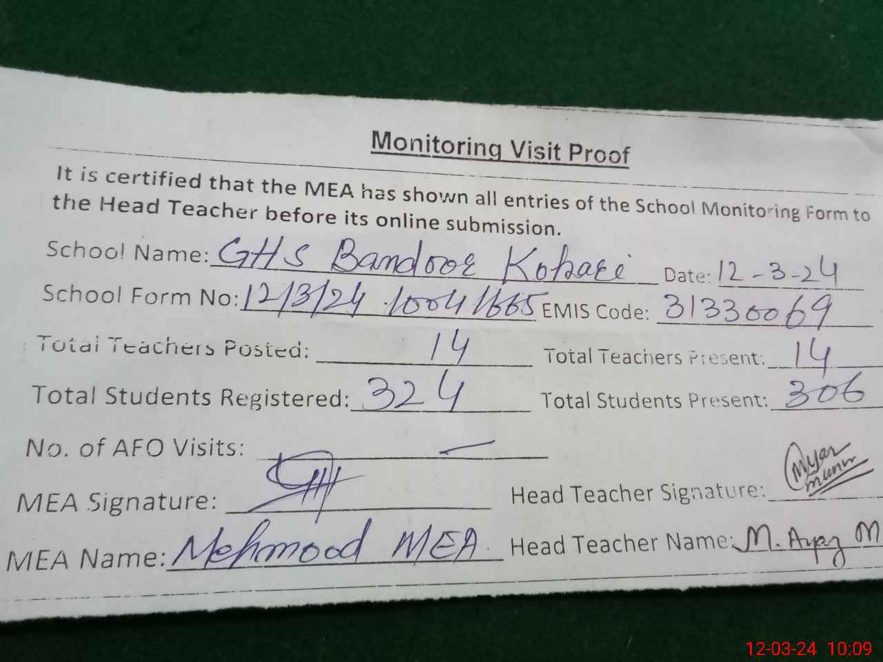| Monitoring Date: 12-03-2024 | Start Time: 12-03-2024 09:43 AM | End Time: 12-03-2024 10:09 AM | Name of MEA: Ma**** UlHa**** | |