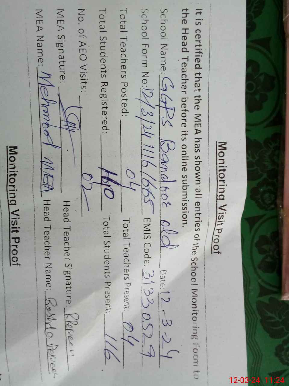 | Attendance Register | Head Teacher | MEA with School | Visit Proof |
