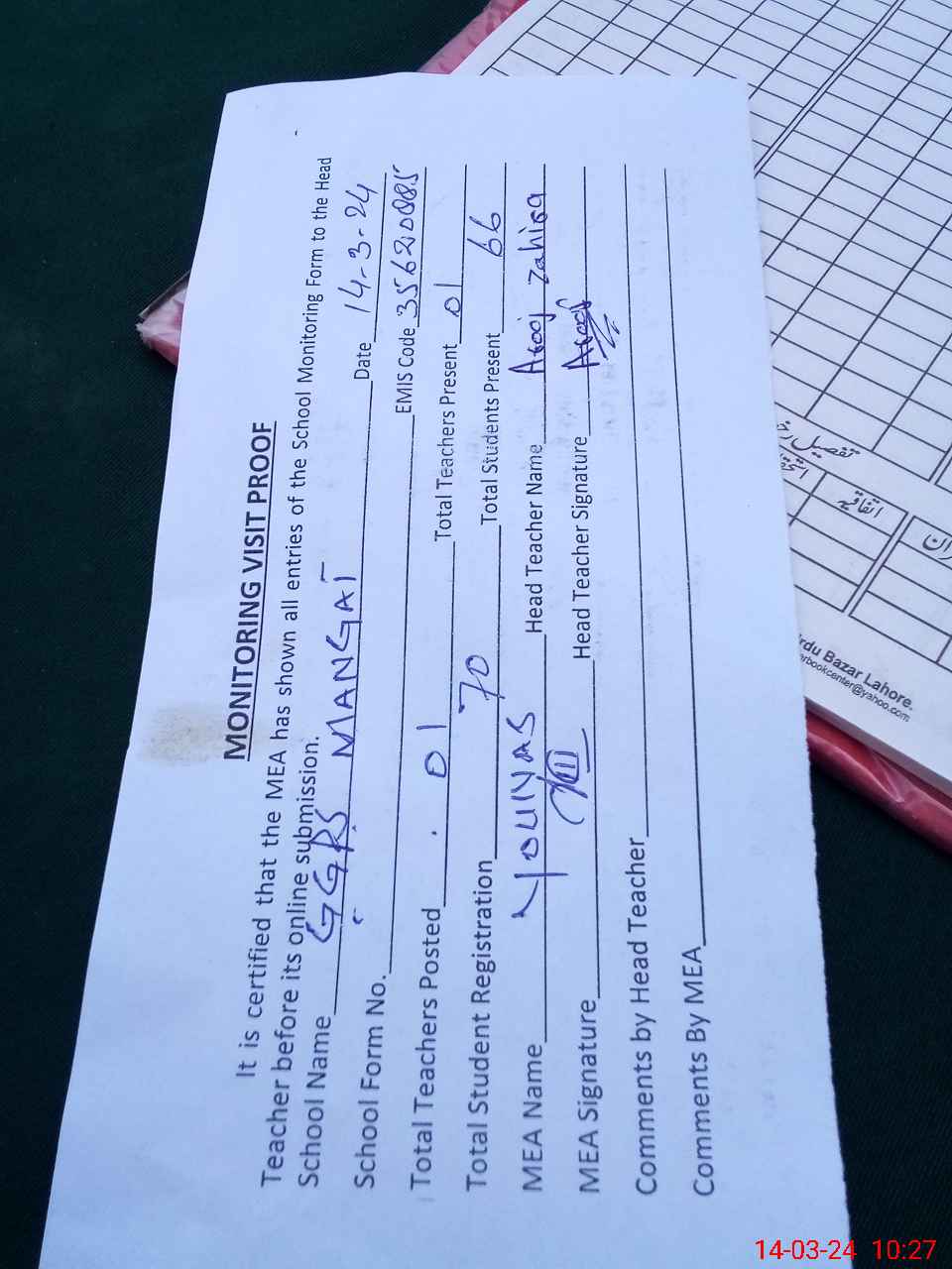 | Attendance Register | Head Teacher | MEA with School | Visit Proof |