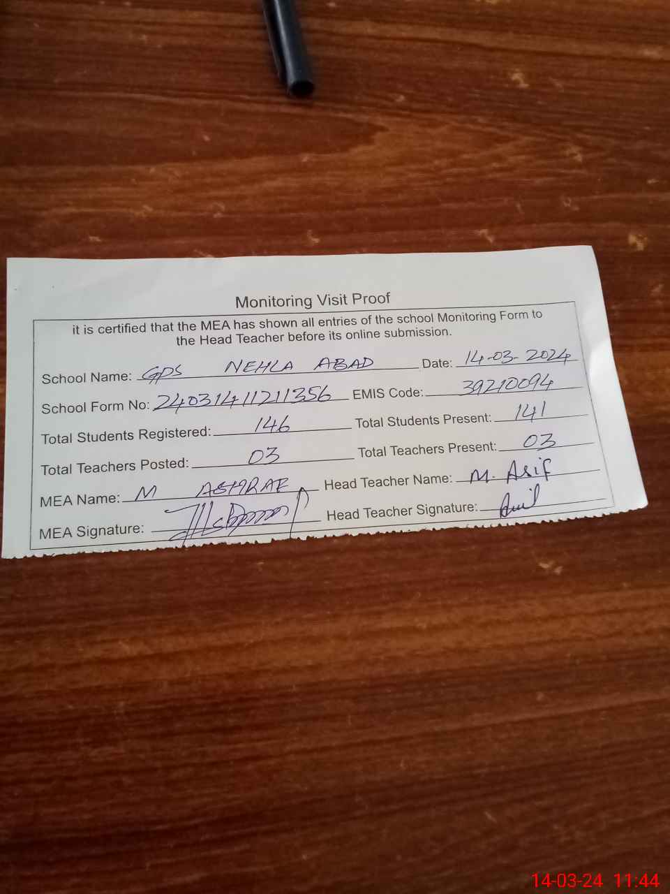 | Attendance Register | Head Teacher | MEA with School | Visit Proof |