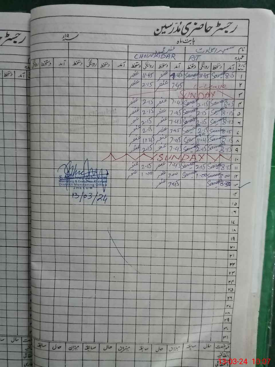 | CNIC | Full Name | Designation | R/C | Absence During Last Calender Month |
