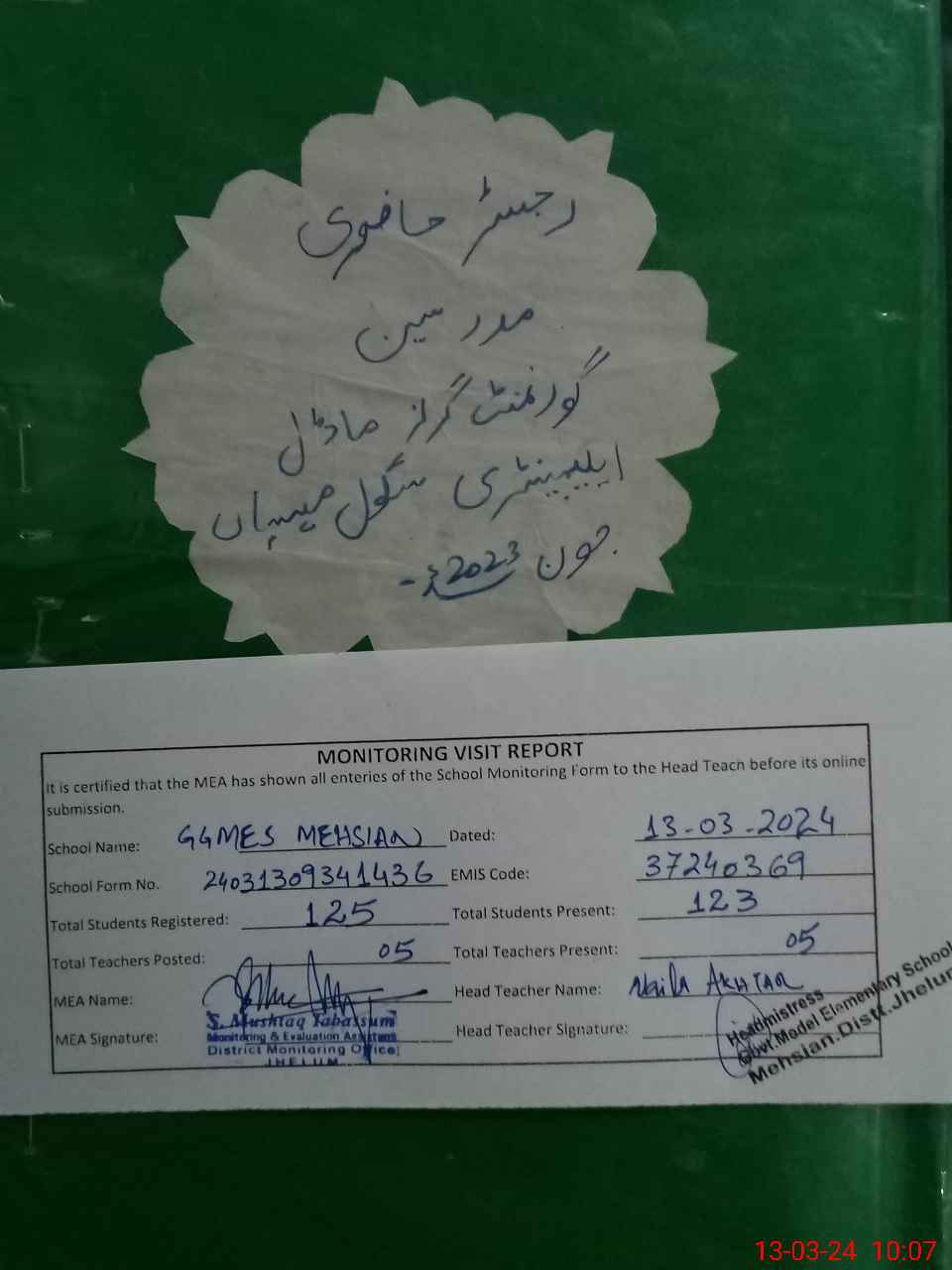 | Attendance Register | Head Teacher | MEA with School | Visit Proof |