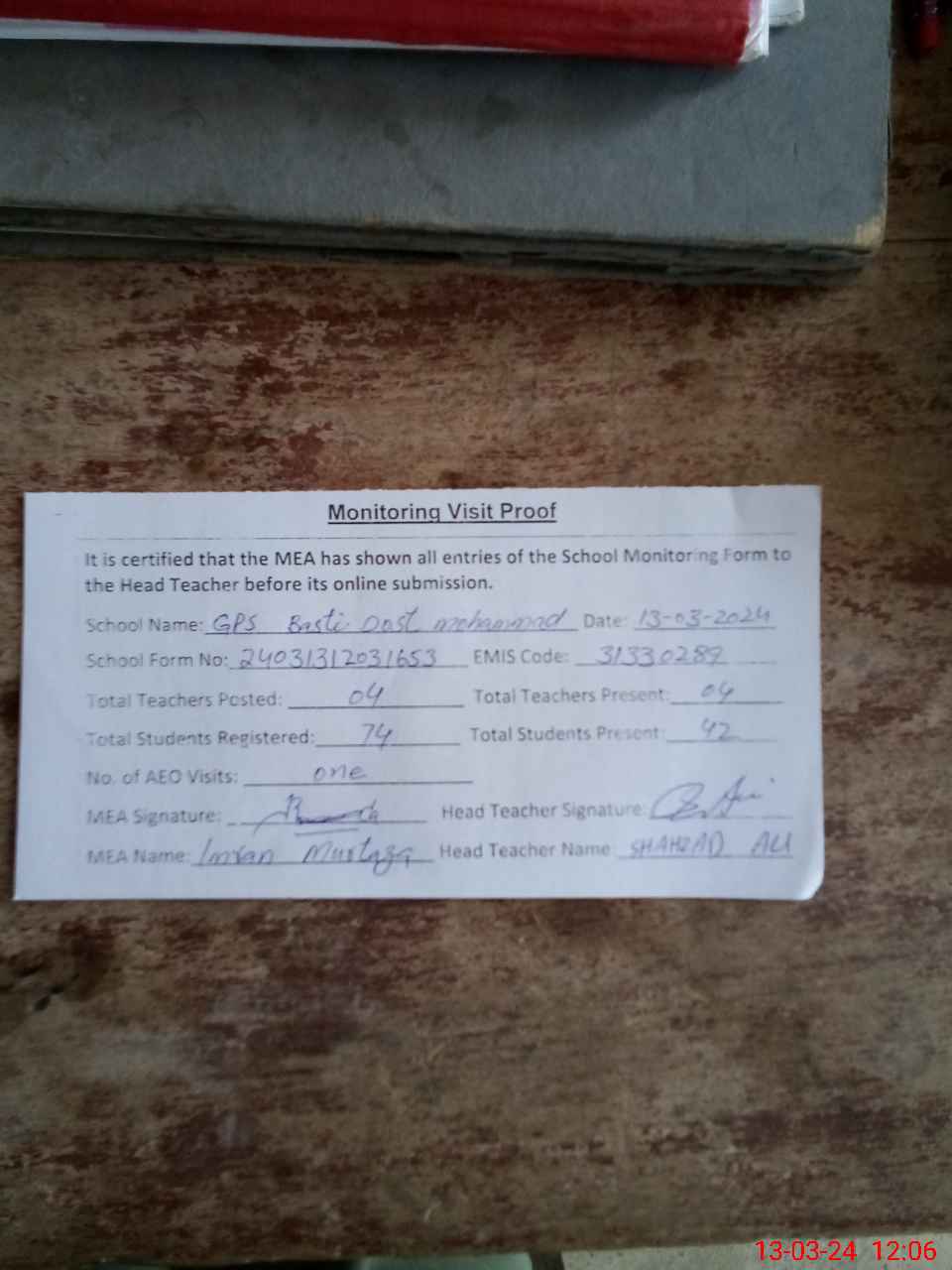 | Attendance Register | Head Teacher | MEA with School | Visit Proof |
