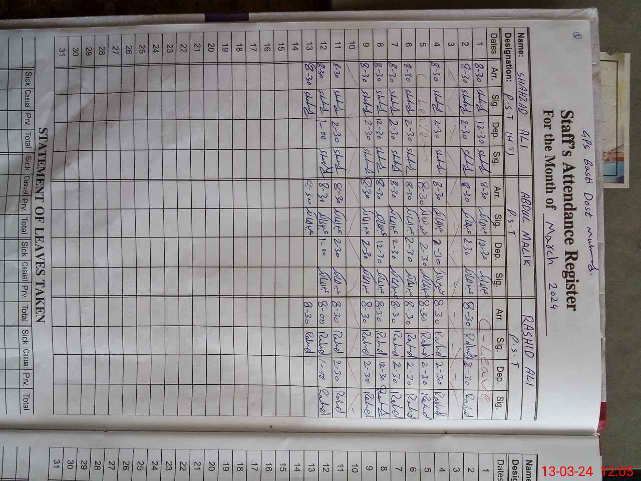 | CNIC | Full Name | Designation | R/C | Absence During Last Calender Month |