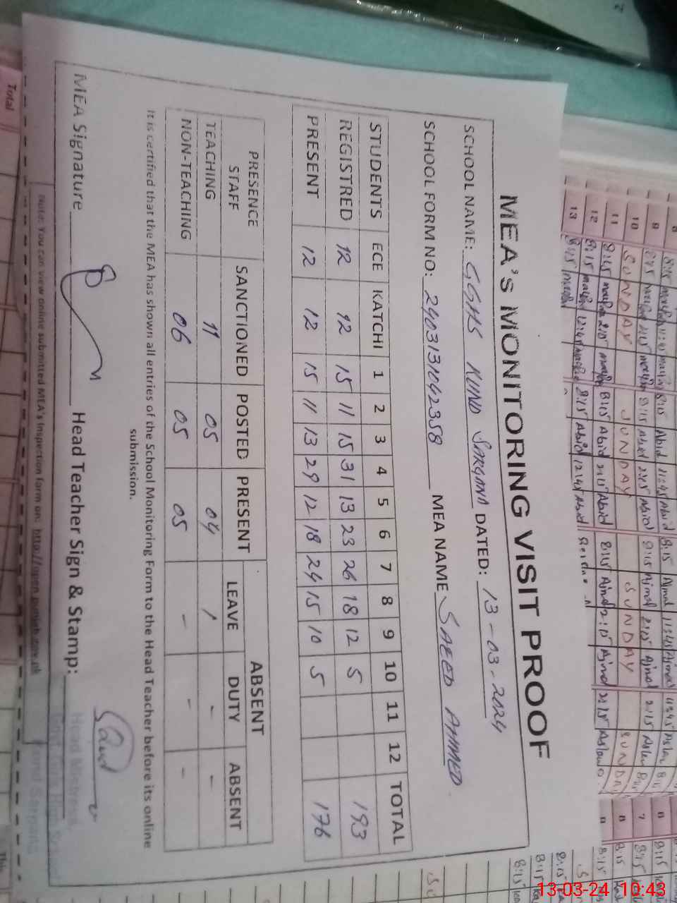 | Attendance Register | Head Teacher | MEA with School | Visit Proof |