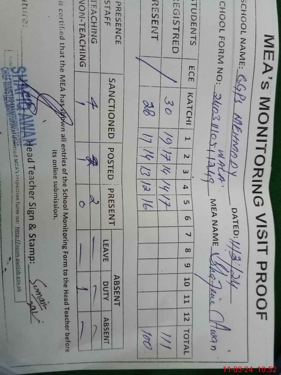 | Attendance Register | Head Teacher | MEA with School | Visit Proof |