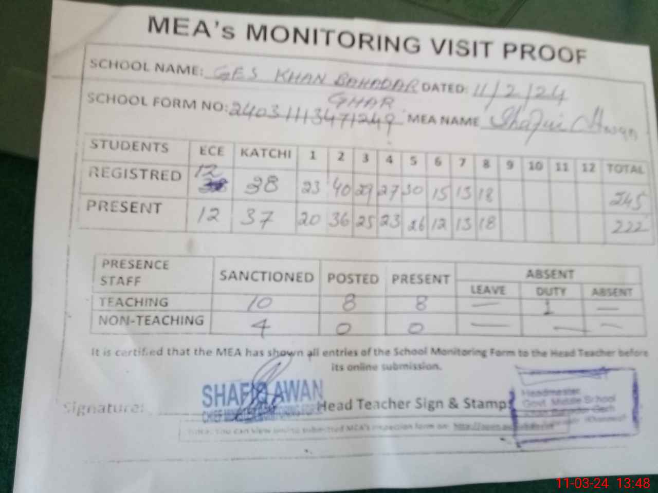 | Certified that this School was Inspected by the Undersigned MEA/DMO Today and the Information Stated Above is as Per Record. | |||||