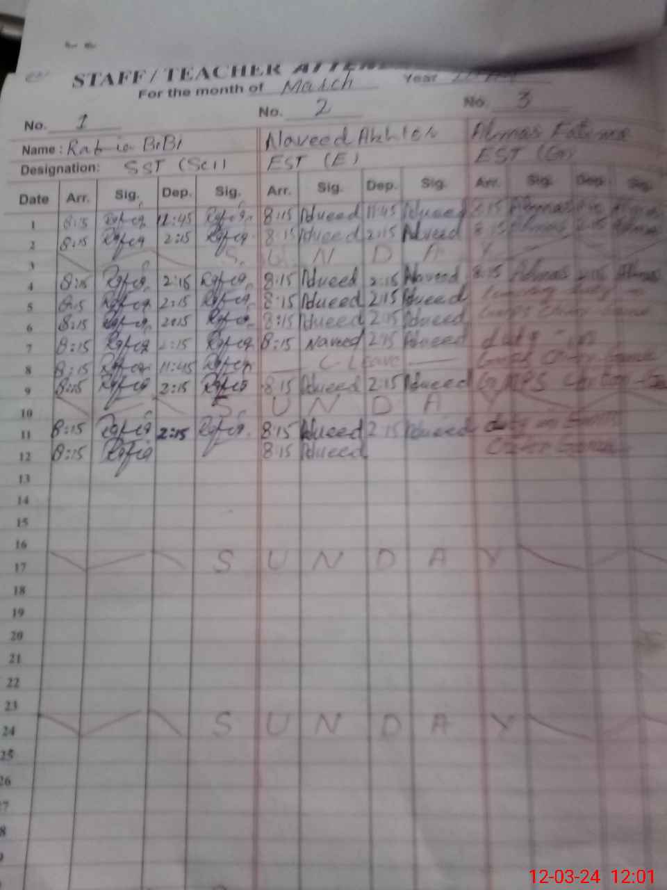 | CNIC | Full Name | Designation | R/C | Absence During Last Calender Month |