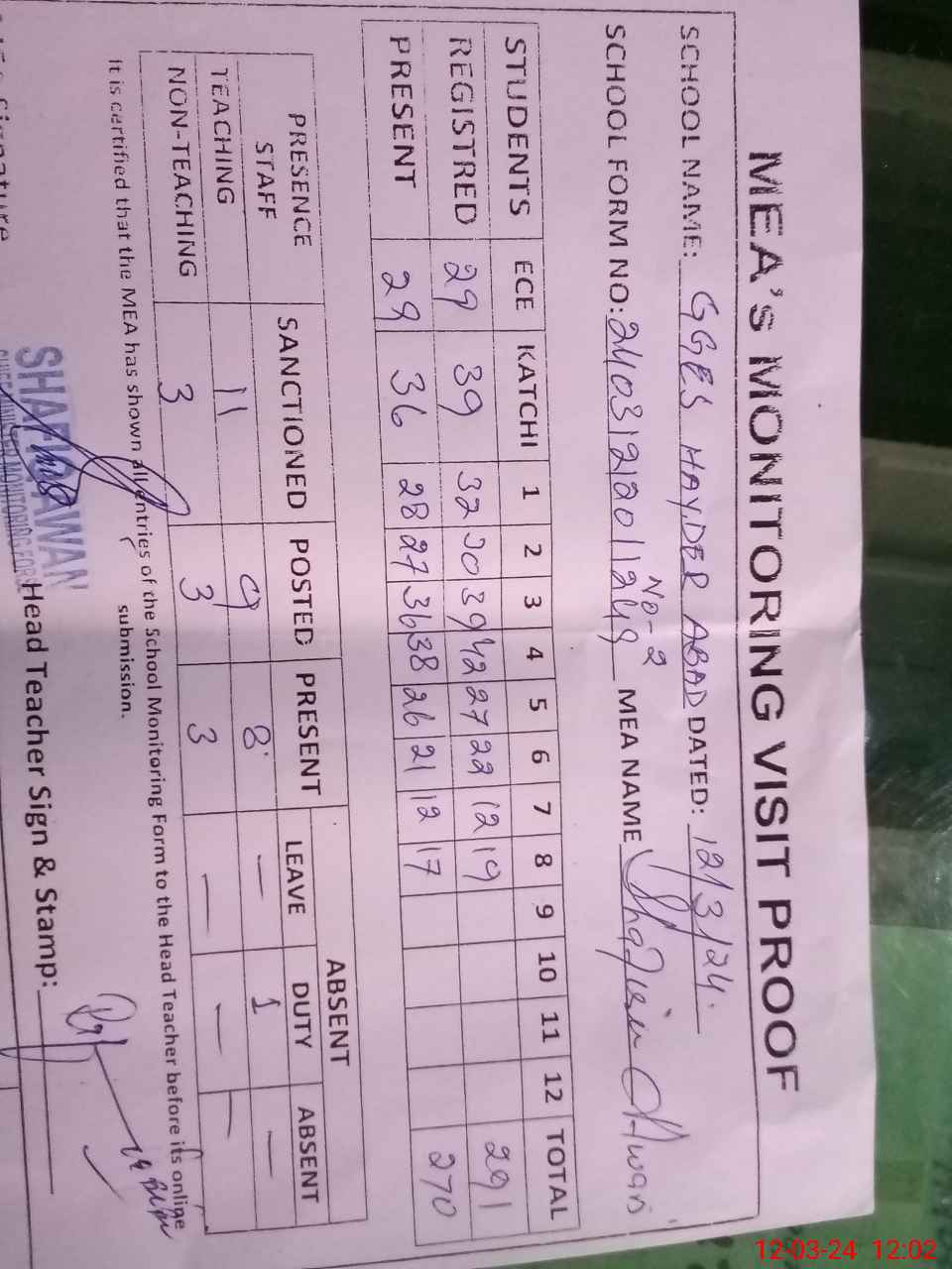 | Attendance Register | Head Teacher | MEA with School | Visit Proof |