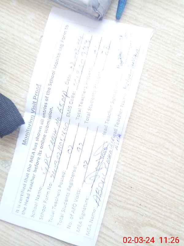 | Attendance Register | Head Teacher | MEA with School | Visit Proof |