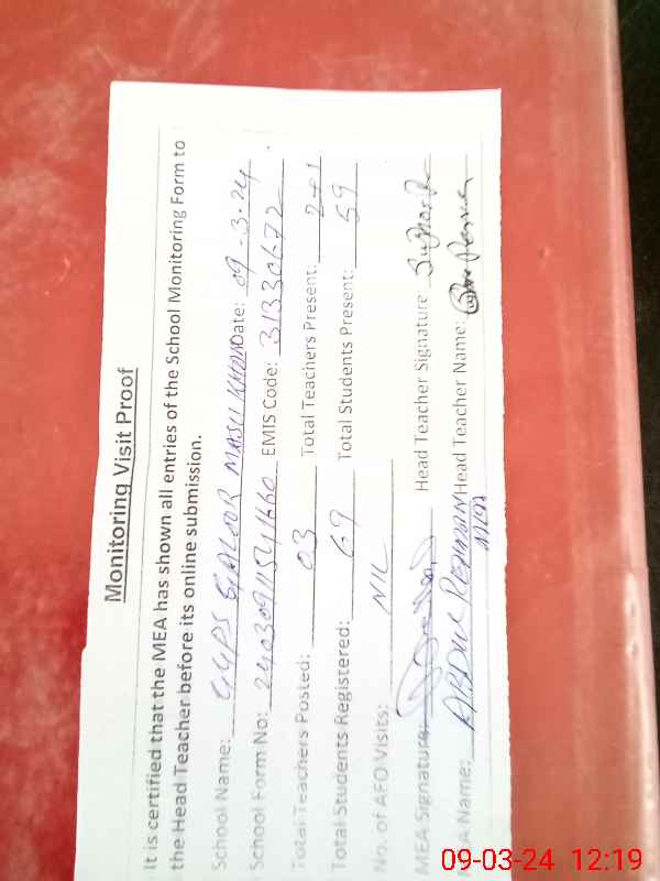 | Attendance Register | Head Teacher | MEA with School | Visit Proof |