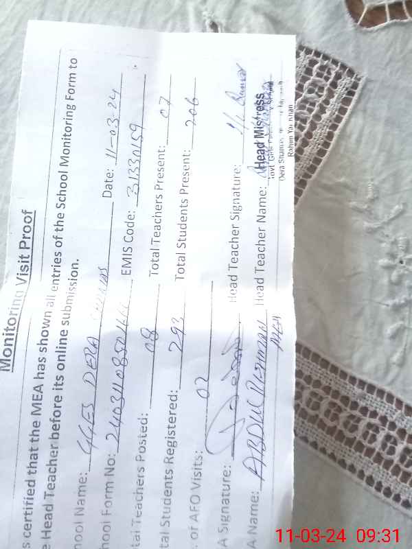 | Attendance Register | Head Teacher | MEA with School | Visit Proof |