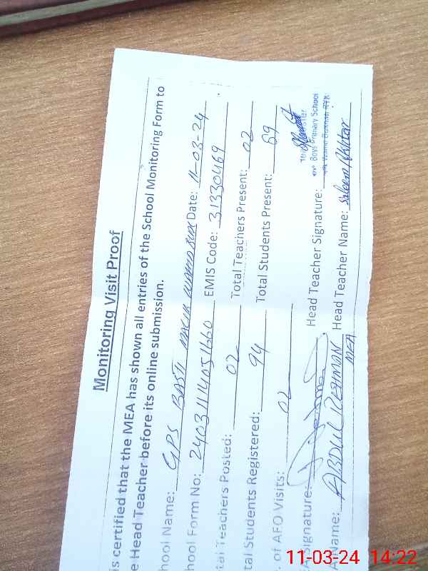 | Attendance Register | Head Teacher | MEA with School | Visit Proof |