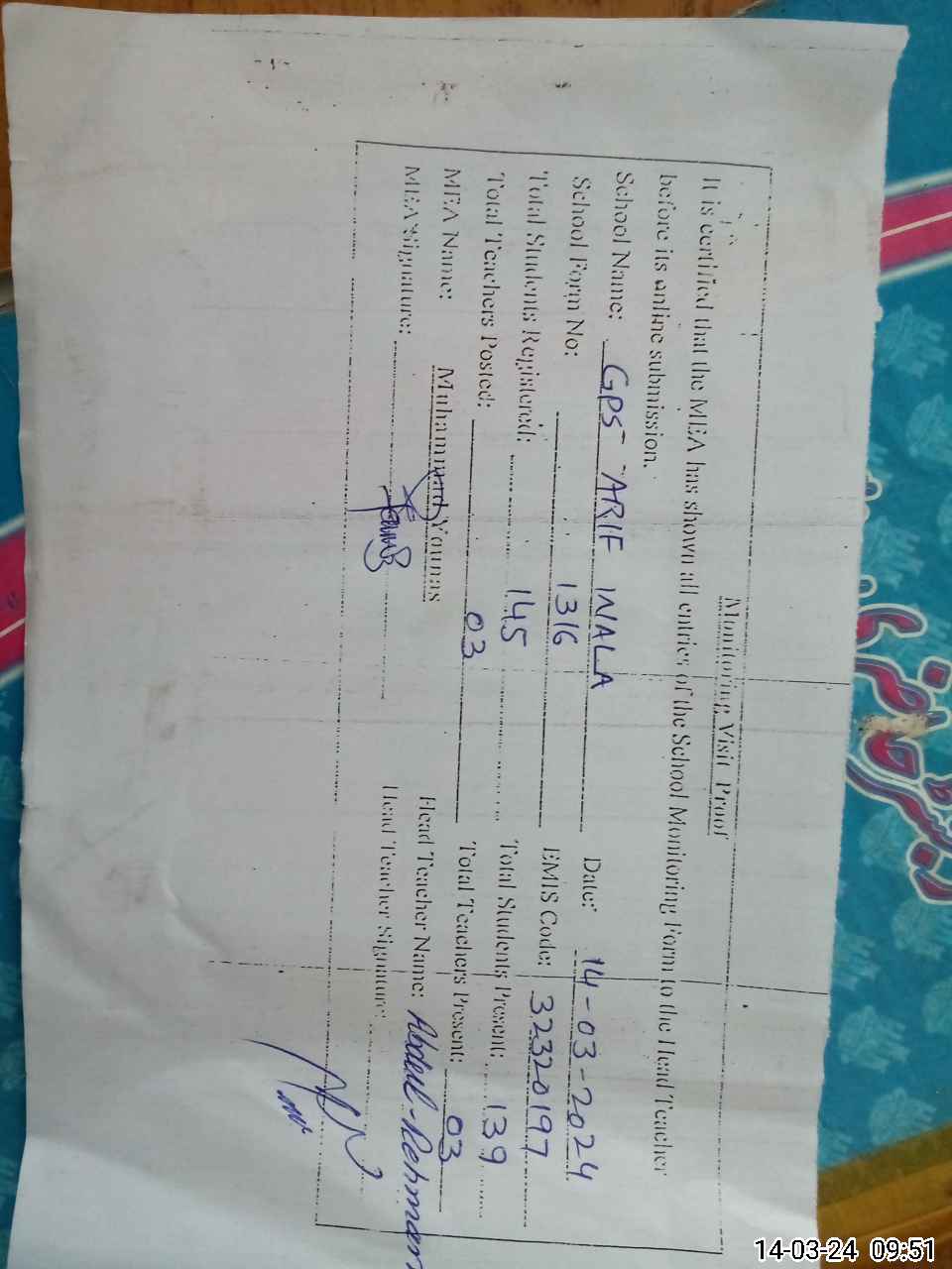 | EMIS Code: 32320197 | Name of School: GPS ARIF WALA | |||