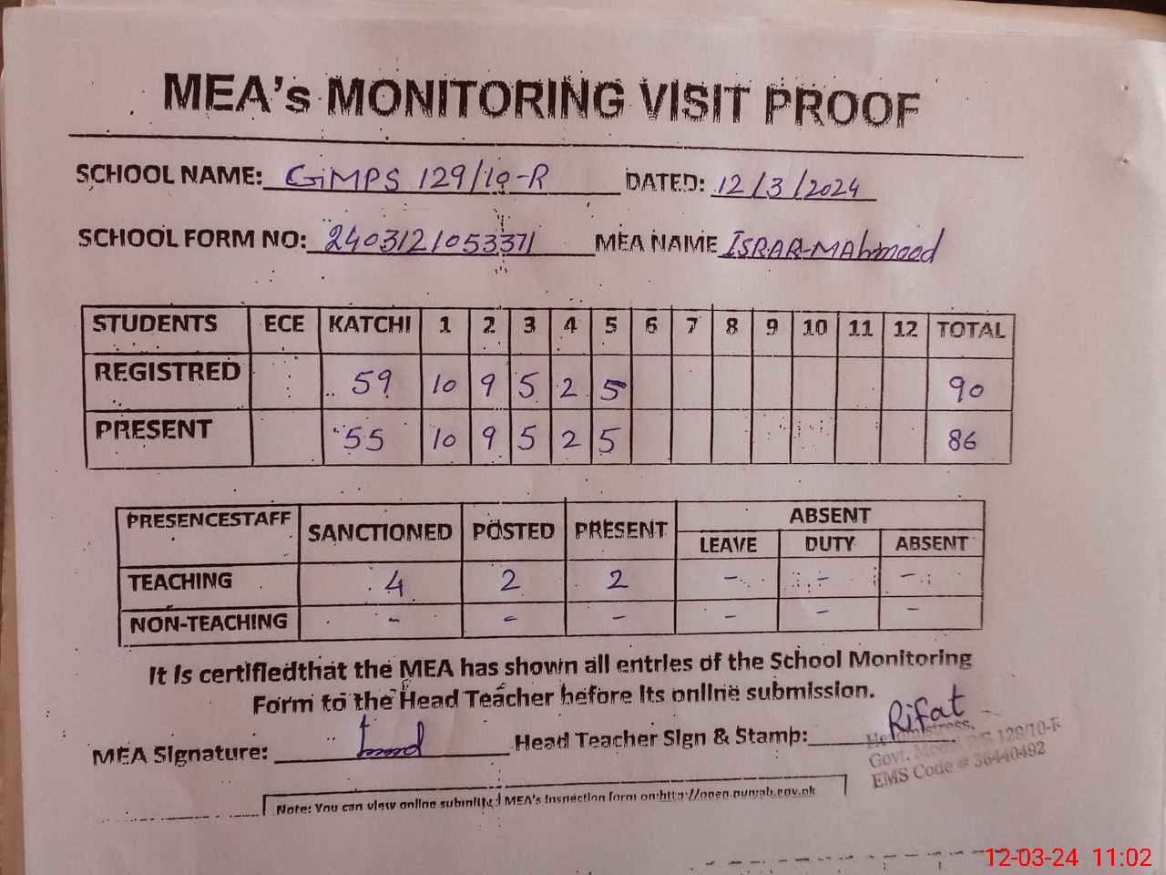 | Attendance Register | Head Teacher | MEA with School | Visit Proof |