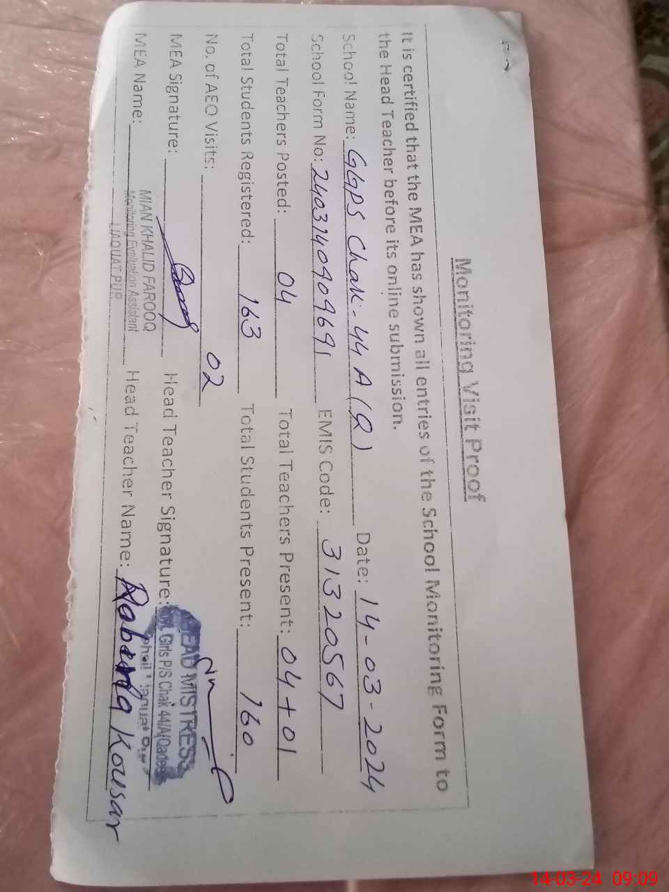| Attendance Register | Head Teacher | MEA with School | Visit Proof |