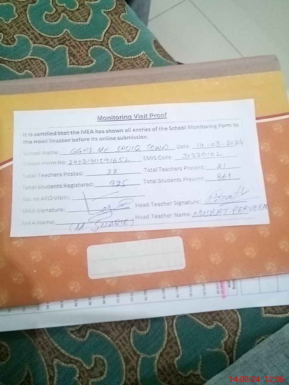 | Attendance Register | Head Teacher | MEA with School | Visit Proof |
