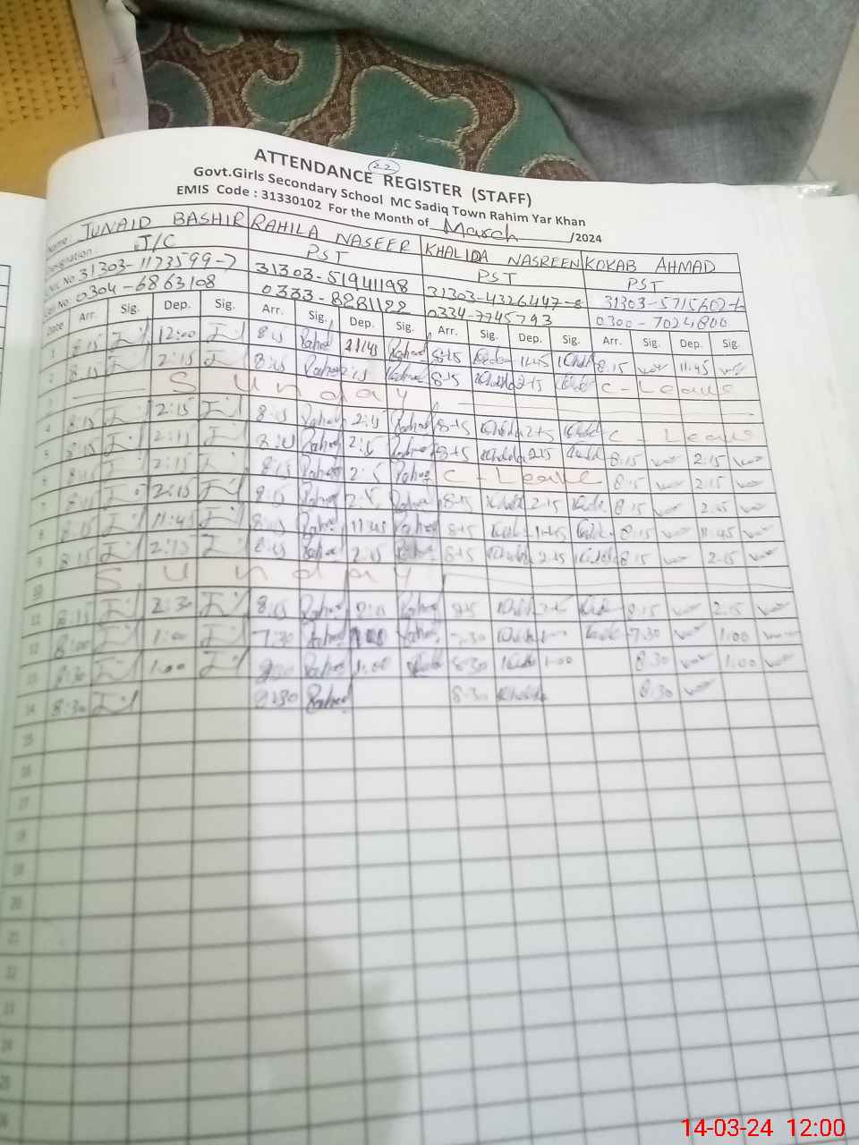 | CNIC | Full Name | Designation | R/C | Absence During Last Calender Month |