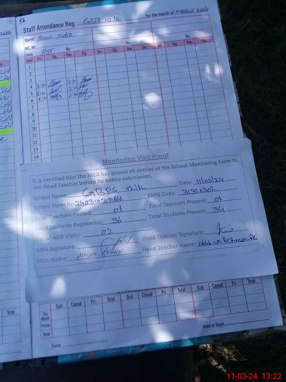 | Attendance Register | Head Teacher | MEA with School | Visit Proof |