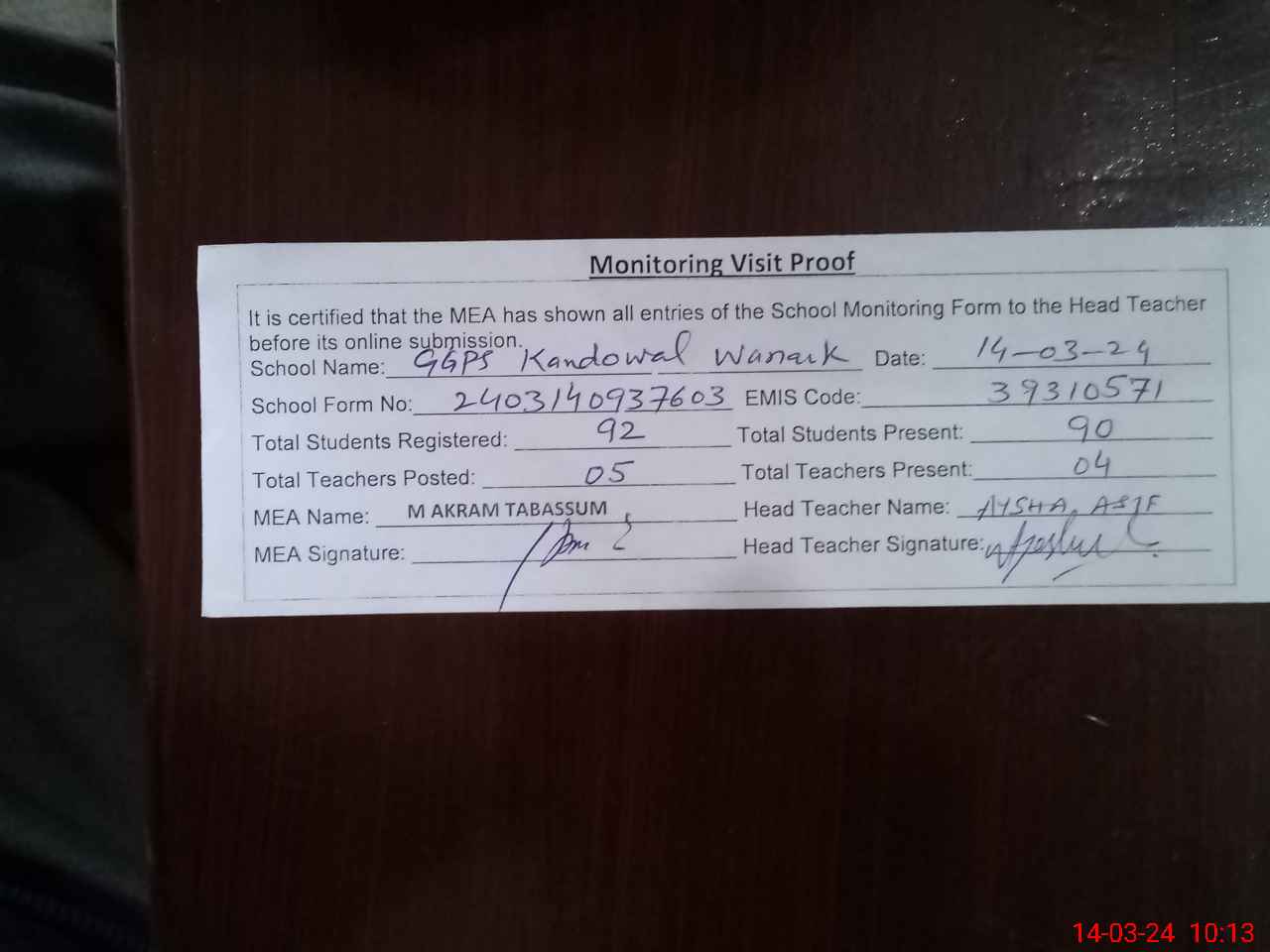 | Attendance Register | Head Teacher | MEA with School | Visit Proof |