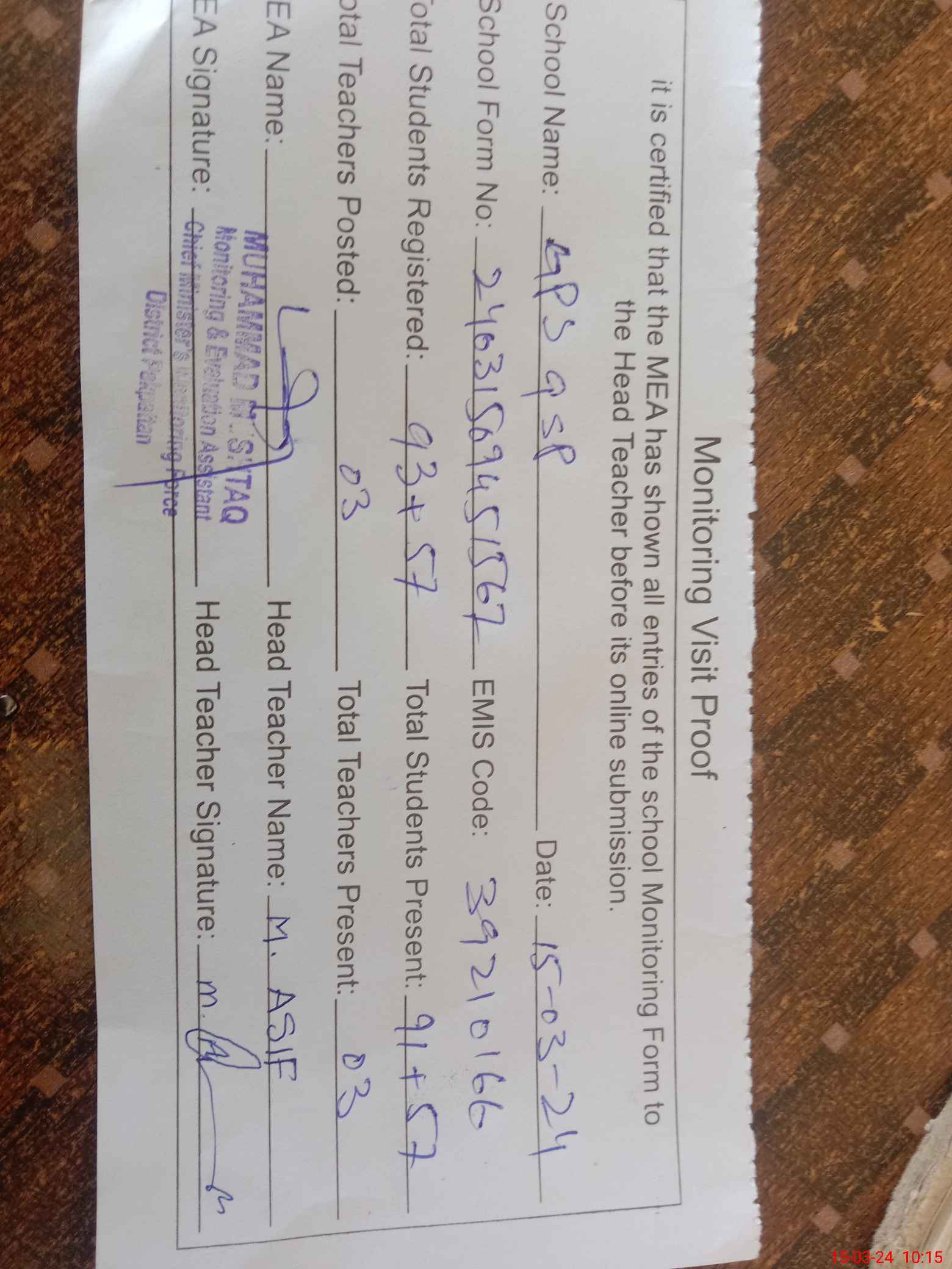 | Name: MAS**** Designation: (School Headmaster's/Headmistress's) PST Phone/Cell Number: 03**** |