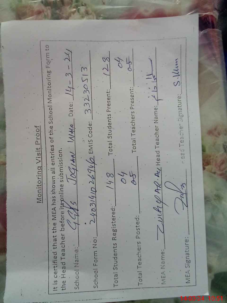 | EMIS Code: 33230513 | Name of School: GGPS JOGIAN WALA | |||