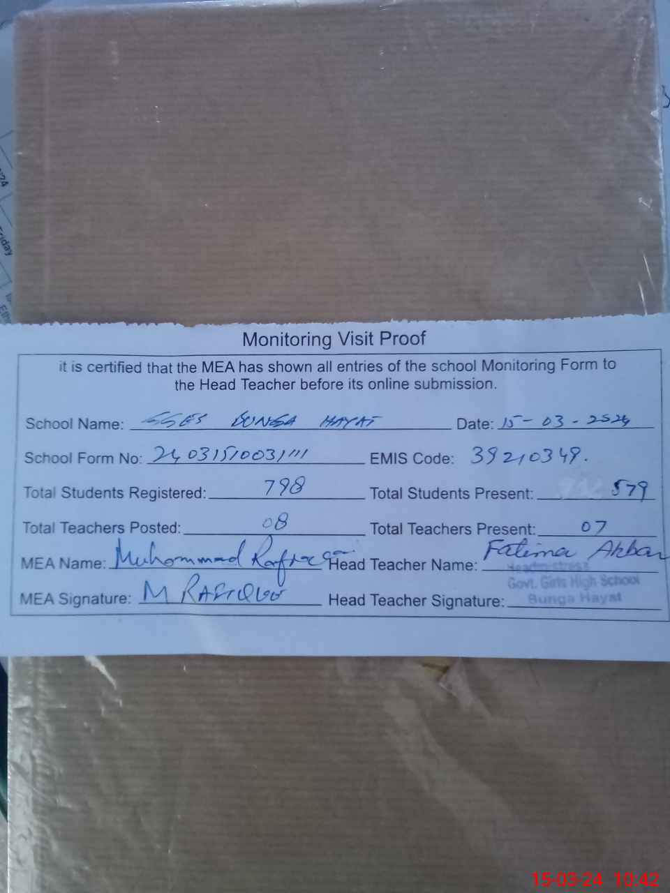 | Attendance Register | Head Teacher | MEA with School | Visit Proof |
