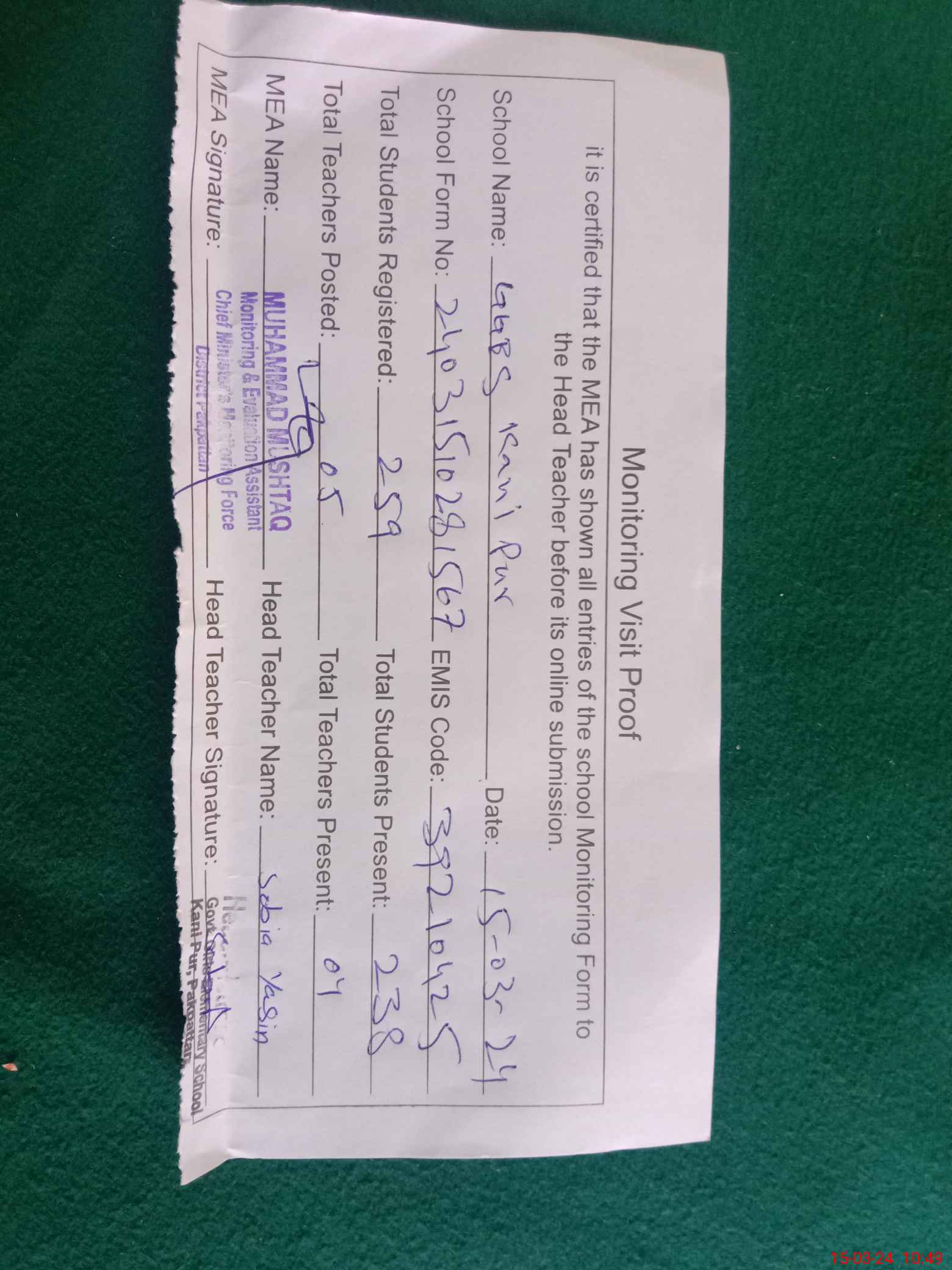 | Certified that this School was Inspected by the Undersigned MEA/DMO Today and the Information Stated Above is as Per Record. | |||||