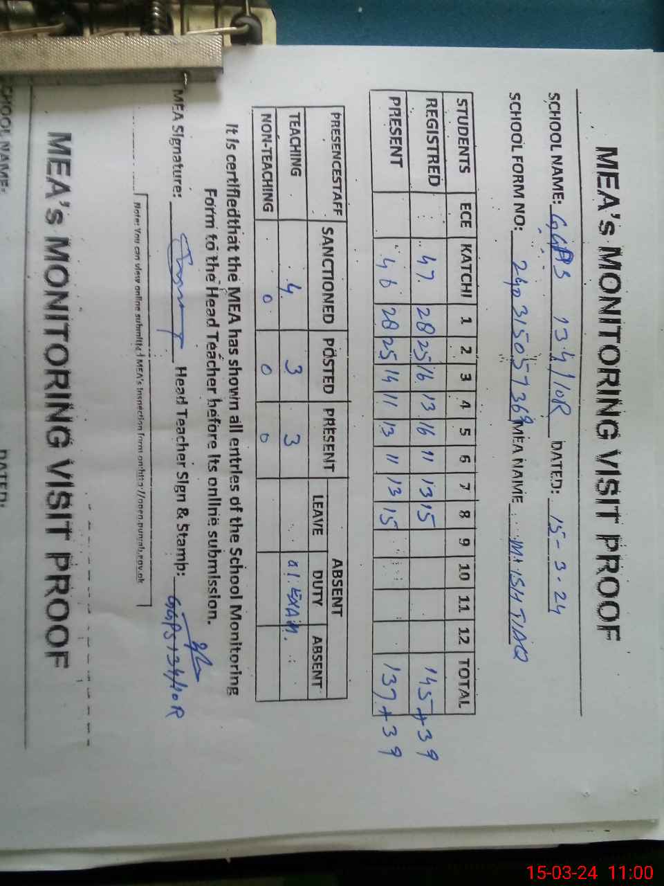 | Monitoring Date: 15-03-2024 | Start Time: 15-03-2024 10:30 AM | End Time: 15-03-2024 11:03 AM | Name of MEA: M.Is**** (S**** 03**** | |