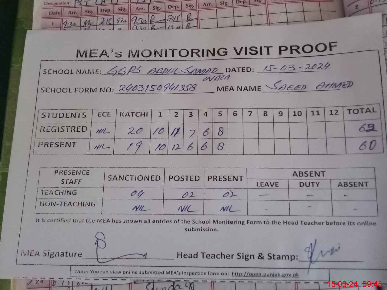 | Attendance Register | Head Teacher | MEA with School | Visit Proof |