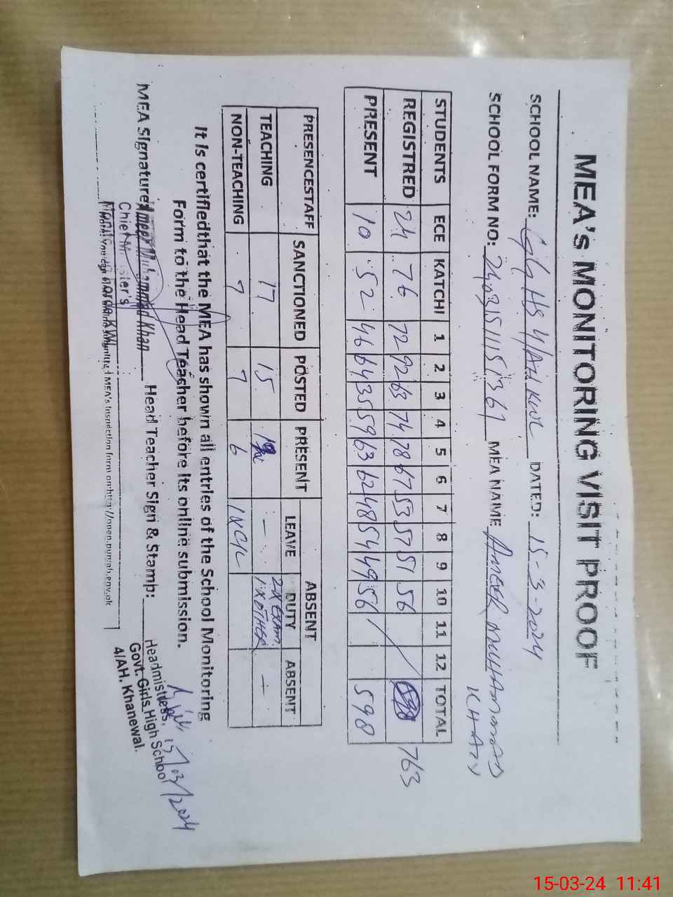 | Attendance Register | Head Teacher | MEA with School | Visit Proof |