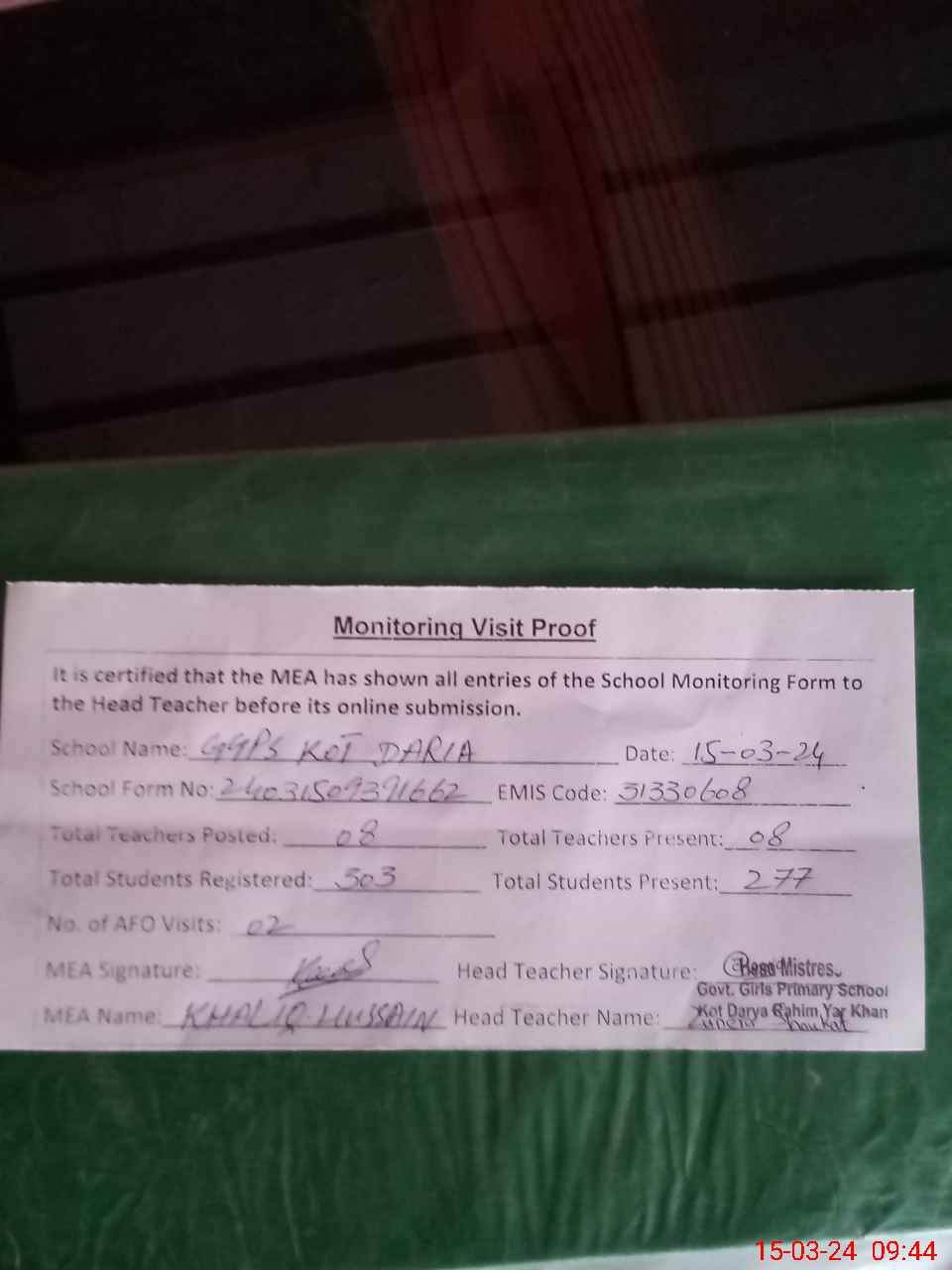 | Attendance Register | Head Teacher | MEA with School | Visit Proof |