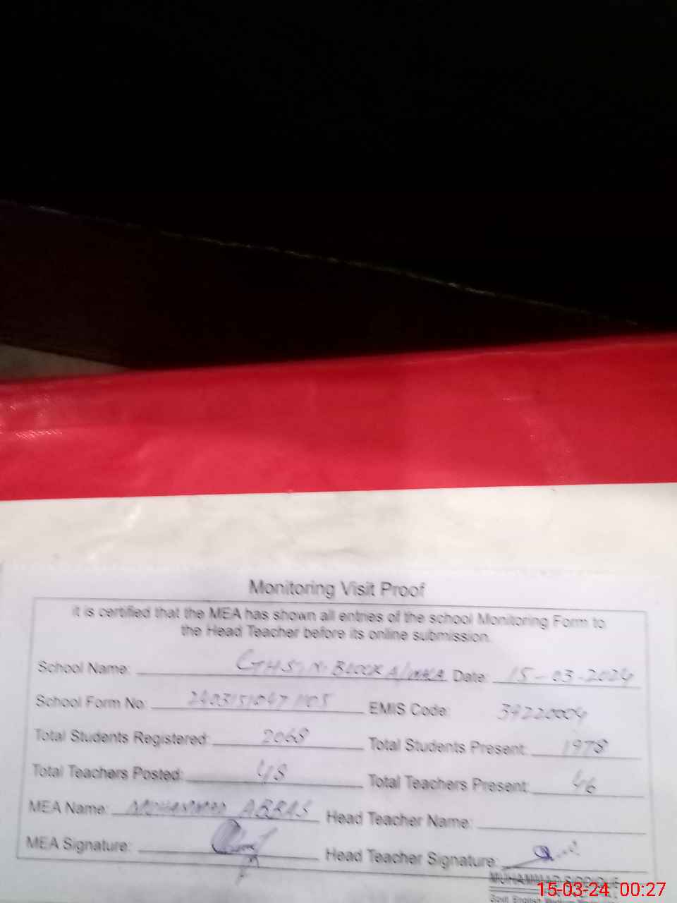 | Attendance Register | Head Teacher | MEA with School | Visit Proof |