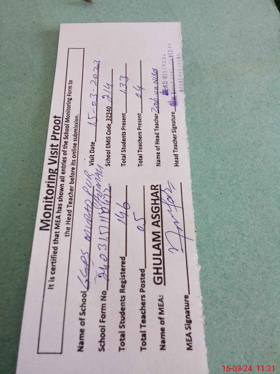 | Attendance Register | Head Teacher | MEA with School | Visit Proof |